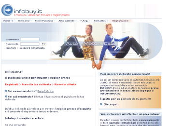 Infobuy srl è una società che nasce dalla brillante idea di due imprenditori. Infobuy offre un servizio web che rappresenta il punto di incontro online tra chi cerca un prodotto e/o servizio e le aziende che lo hanno a disposizione . E’ un modo veloce per trovare il miglior prezzo d'acquisto e consente agli utenti di risparmiare tempo e denaro. L’ utente che si registra e pubblica la sua richiesta, riceve i preventivi e le offerte di concessionarie e agenzie immobiliari della sua zona. Le aziende, dopo aver effettuato la registrazione, possono accedere ad un'area riservata e visualizzare le richieste di preventivo provenienti dalla propria zona operativa.